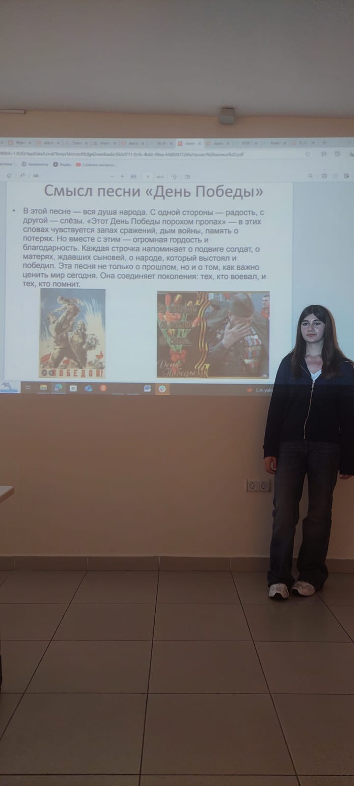 Песни Великой Отечественной войны… В них сила и мощь страны, уверенность в победе, любовь к близким, скорбь по погибшим. Именно об этих особенностях песен рассказывали ученики 7 класса, принявшие участие в проекте «Песни военных лет». Ребята подготовили информацию об авторах стихов и композиторах, рассказали о первом исполнителе песни, о ее дальнейшей истории. «Катюша» и «Землянка», «Три танкиста» и «Случайный вальс» и многие другие песни вызвали отклик в душах учеников: семиклассники, слушая песни, тихонько подпевали исполнителям.
